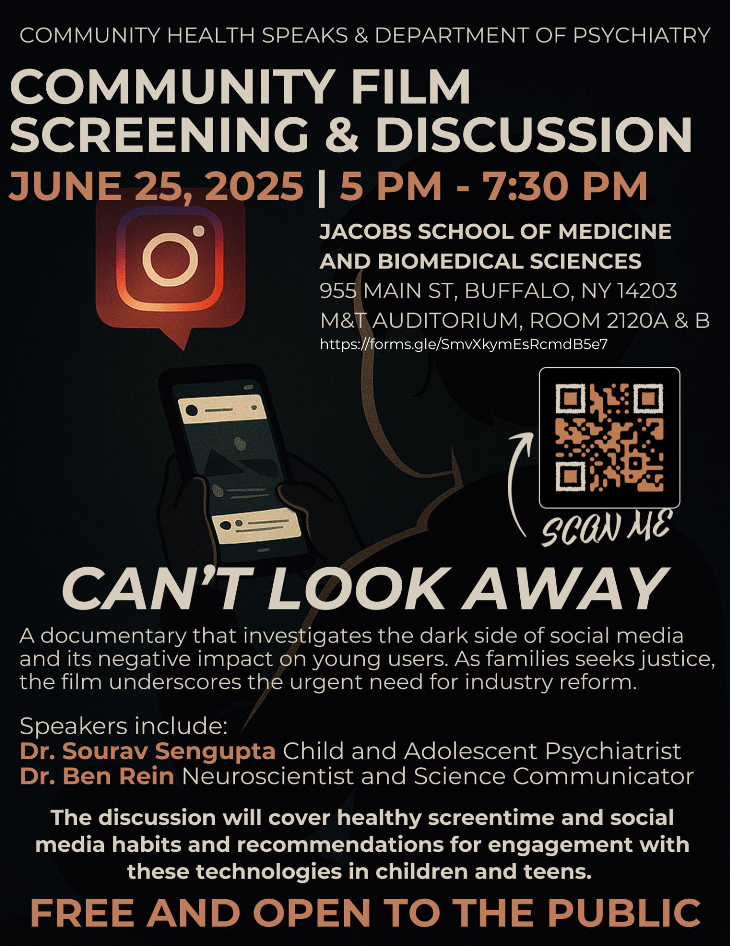 Community Health Speaks and the UBMD Department of Psychiatry hosted an insightful evening featuring a screening of Can't Look Away, a powerful documentary exploring the dark side of social media and its impact on young users. After the screening, attendees participated in an engaging discussion led by neuroscientist and science communicator Dr. Ben Rein and child and adolescent psychiatrist Dr. Sourav Sengupta. Parents, educators, students, and clinicians actively contributed to the conversation, sharing thoughtful questions and personal experiences, deepening the collective understanding of the science, ethics, and emotional realities surrounding screen time, youth mental health, and digital safety.